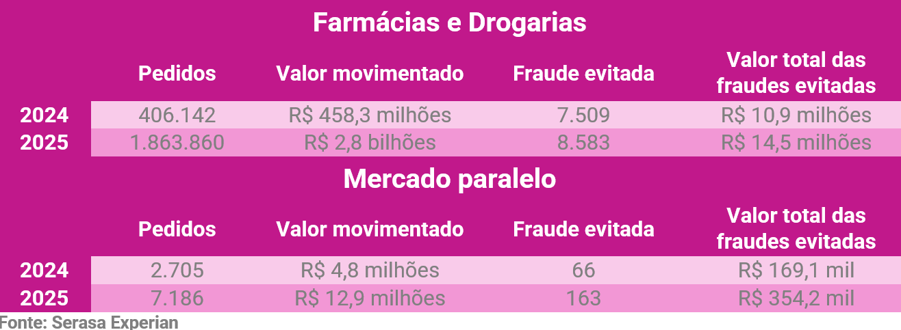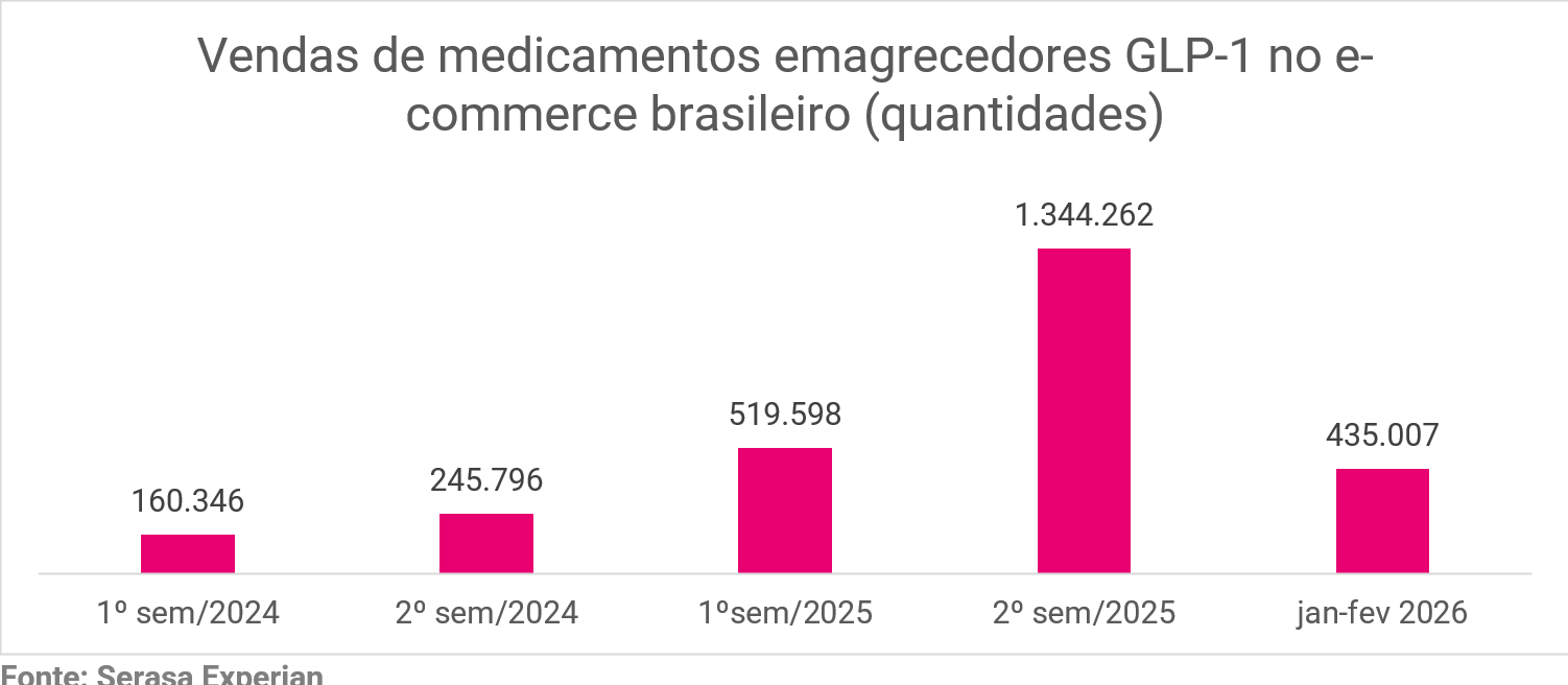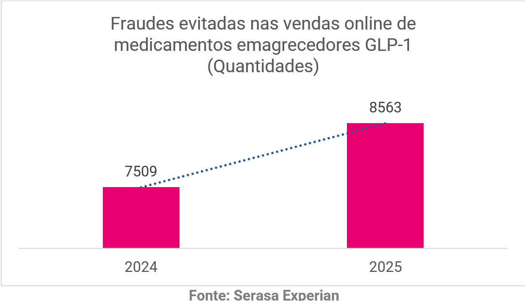 O e-commerce brasileiro registrou 1,8 milhão de pedidos de medicamentos a base de GLP-1 no ano passado, hormônio associado ao controle da glicose e à saciedade, representando um volume 358% superior ao de 2024. Em valores, as transações somaram R$ 2,8 bilhões, mais de seis vezes acima do registrado no ano anterior. Apesar de não ser na mesma medida, as tentativas de golpes também crescem: segundo a Serasa Experian, primeira e maior datatech do Brasil, houve uma alta de 14% nas fraudes evitadas em 2025 nas vendas desses produtos, na comparação com 2024.